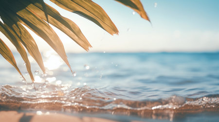 Tropical beach with palm leaf and water splashes at sunset