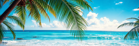 Beautiful tropical beach with white sand, palm trees, turquoise ocean against a blue sky with clouds on a sunny day. Perfect landscape backdrop for a relaxing holiday, island. banner.generative AI