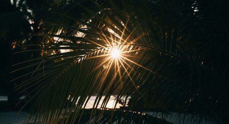 sunlight pierces through foliage of palm tree, illuminating intricate patterns on leaves. Background awash with golden hue from sun, creating inviting ambiance