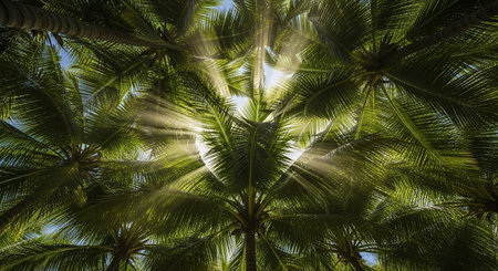 Photo of sun rays passing through the lush green palm tree leaves, beach summer concept, background