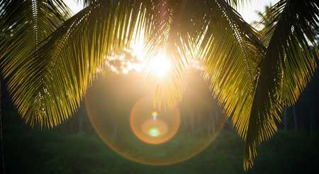 Beautiful sunlight beams shine through the palm leaves, creating a stunning flare effect in a tropical setting, evoking feelings of relaxation and serenity.