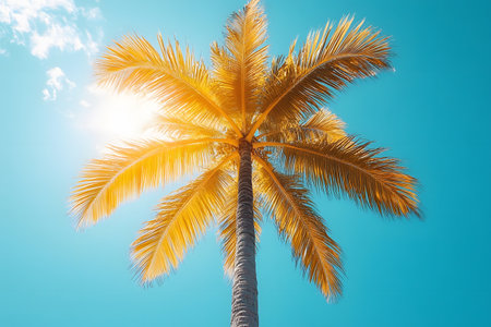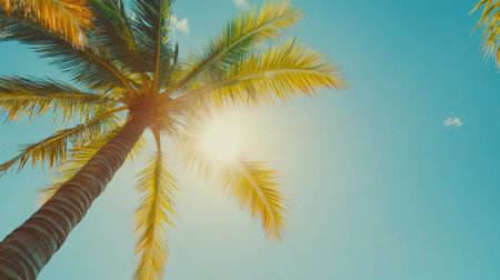 Sunlight filters through the vibrant fronds of a tall palm tree, creating a stunning silhouette against a clear blue sky. the image radiates tropical warmth and is ideal for summer-themed designs or travel promotions. Generative AI