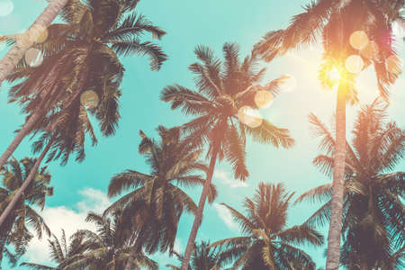 Vintage Palm trees background with the blue sky at the tropical coast, retro tone, coconut tree, summer tree.