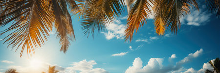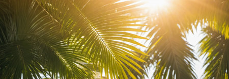 Sunlight filters through lush green palm leaves, casting warm tropical glow. nature themed designs, highlighting natural patterns, textures in serene setting. panoramic banner