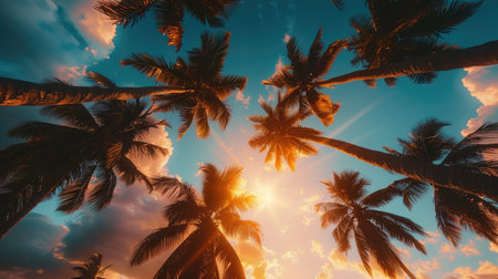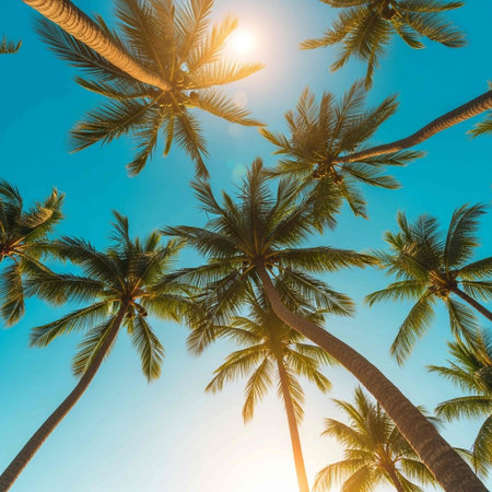 Exotic tropical palm trees at summer, view from bottom up to the sky at sunny day.
