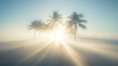 A stunning sunrise illuminates palm trees through a gentle mist, creating a tranquil beach atmosphere that captures the essence of serenity and nature's beauty.