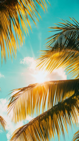 Beautiful sunlight beams shine through the palm leaves, creating a stunning flare effect in a tropical setting, evoking feelings of relaxation and serenity.