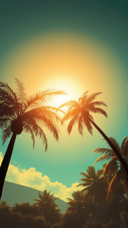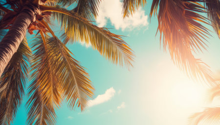 Generative AI : Beautiful palm leaves on sunset against blue sky in sunshine Palm trees at tropical coast in summer vintage retro toned and stylized image copy space