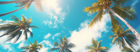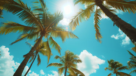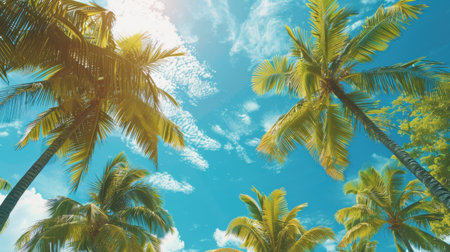 A serene view looking up through a canopy of lush, green palm trees set against a vivid blue sky dotted with a few white clouds. the sunlight filters through the palm fronds, creating a peaceful and tropical atmosphere perfect for summer-themed designs. Generative AI