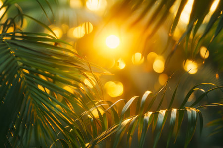 Golden sunset through palm leaves