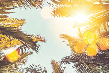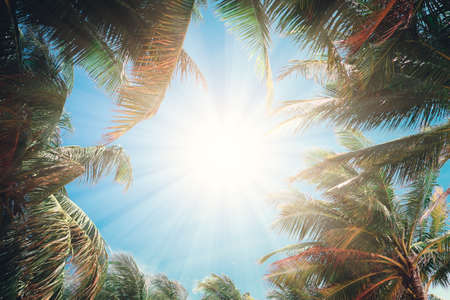 Blue sky and palm trees, vintage style. Summer background concept