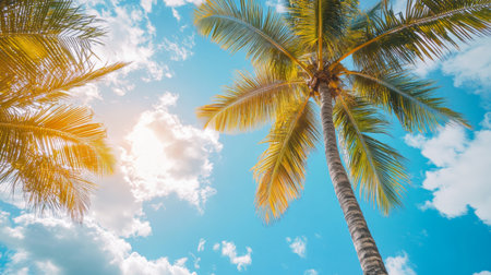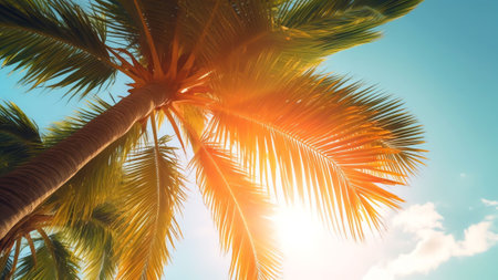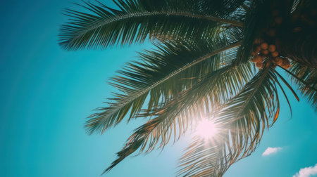 Photo of sun rays passing through the lush green palm tree leaves, beach summer concept, background