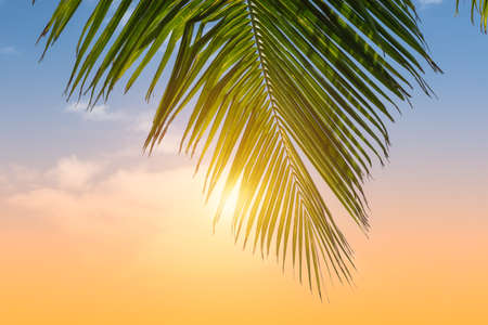 Palm leaf against colorful sunny sky.
