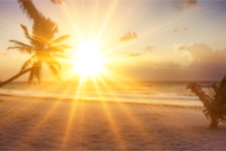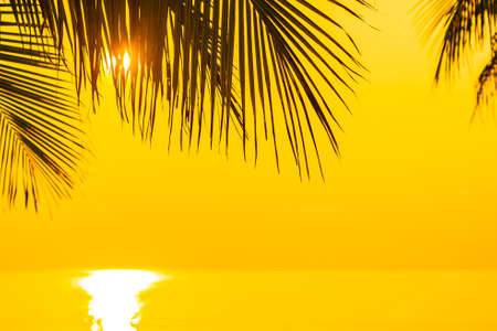 Tropical beach summer background with palm trees silhouette at sunset. Bright sunny tropical landscape, sunshine, palm leaf and light