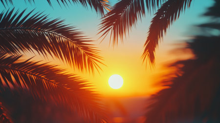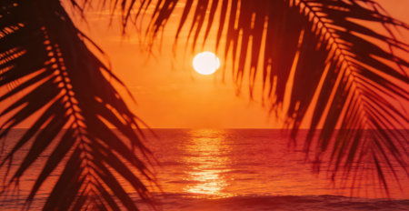 A stunning sunset viewed through palm leaves at a tranquil beach. The scene showcases vibrant colors, creating a serene and peaceful atmosphere perfect for relaxation.