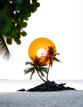 Golden sun sets on the horizon, casting warm hues over palm trees in a serene minimalist landscape showing beauty and tranquility.