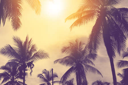 Coconut palm trees on sunset sky background. Vintage toned