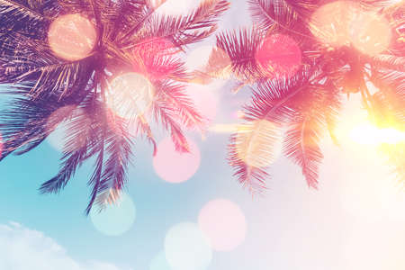 Tropical palm tree with sun light on sunset sky and cloud abstract background. Summer vacation and nature travel adventure concept. Pastel tone filter effect color style.