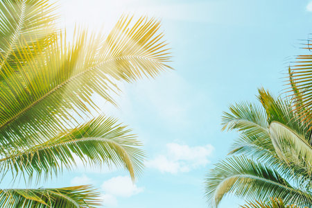Tropical palm tree with blue sky and cloud abstract background. Summer vacation and nature travel adventure concept. Pastel tone filter effect color style.