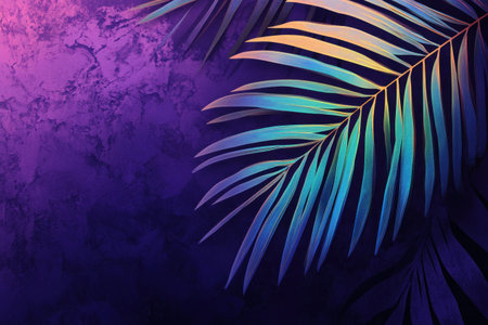 A palm leaf in the style of digital art, close-up, with a dark purple background, featuring an electric blue gradient and a grainy texture. The pattern is reminiscent of neon lights, creating a futuristic vibe. This design would be suitable for graphic or print applications. --ar 3:2 --v 6.1 Job ID: 624b3680-919a-4b6f-9c88-82a2a3f4f41c