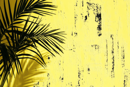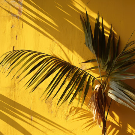 A stunning tropical palm leaf casts a delicate shadow over a bright yellow wall, merging natural beauty with vibrant color. Perfect for decorative and artistic themes.