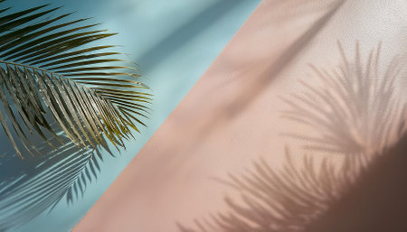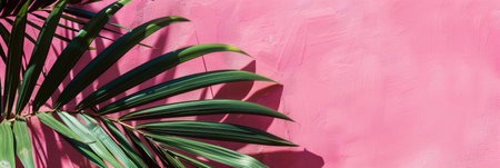This image features lush green palm leaves casting beautiful shadows on a soft pink background, providing a vibrant aesthetic perfect for summer themes.