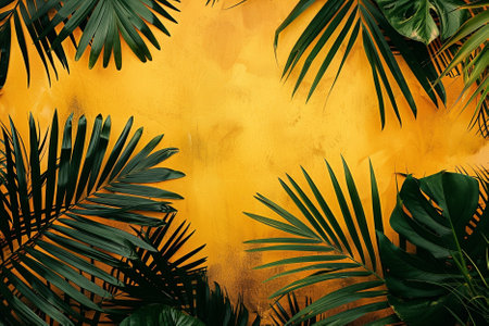 Palm tree leaves on yellow wall background. Tropical summer concept.