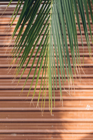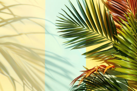Colorful palm tree leaves background with copy space for text. Floral pattern wallpaper with shadows from shining sun.
