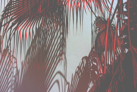 Palm leaves contour and contrasting darks, shadows on a white wall background. Tropical trees in pale colors with noise grainy effect. Exotic nature