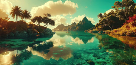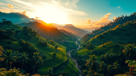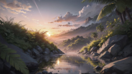 A fantastic sunset on the mountains with a tropical jungle. A stream flows between palm trees