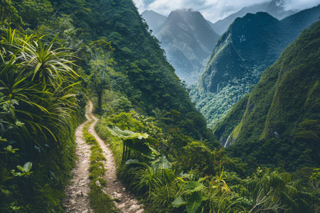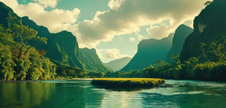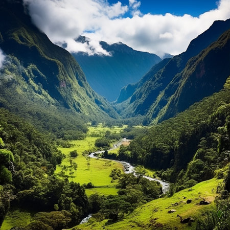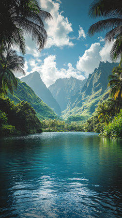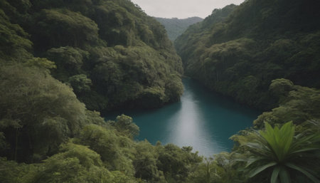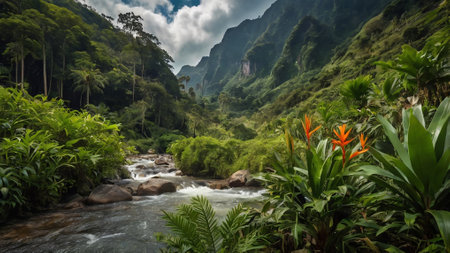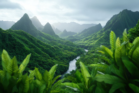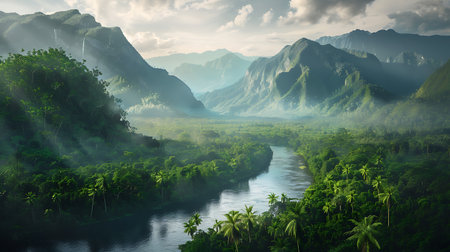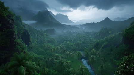 Breathtaking tropical landscape featuring lush greenery, a winding river, and towering mountains under dramatic skies, evoking a sense of tranquility and adventure.