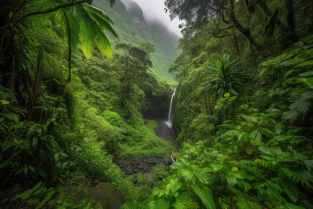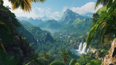 A lush green jungle with a waterfall in the background. Concept of tranquility and natural beauty