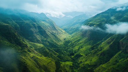 Overhead shot of a lush green valley nestled between mountain ridges with plenty of copy space in the sky