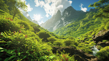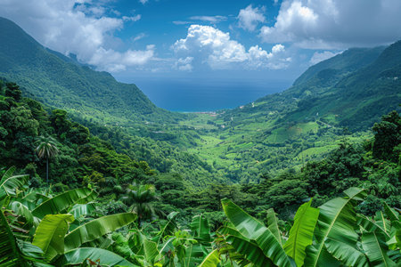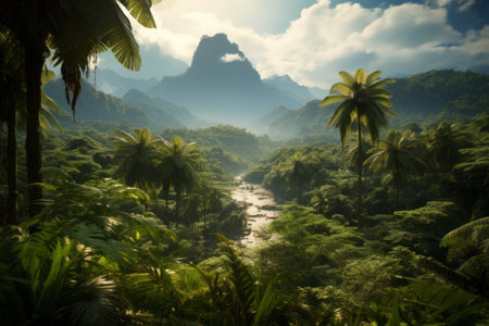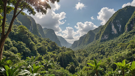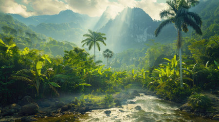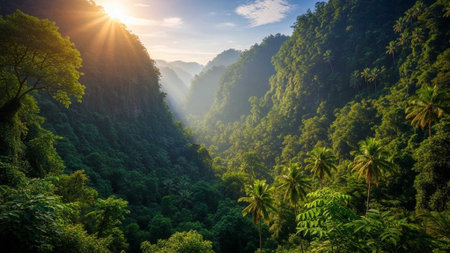 Discover the breathtaking beauty of a tropical forest featuring dense greenery and palm trees nestled within a serene mountain valley, creating a peaceful escape.
