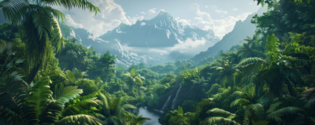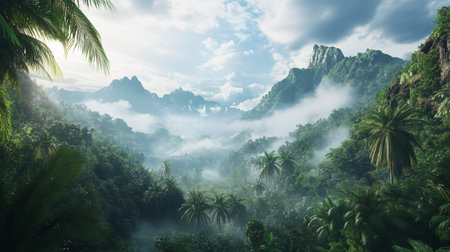 A dense tropical rainforest filled with vibrant greenery unfolds against a backdrop of mist-covered mountains. Morning light filters through the lush foliage creating a serene ambiance.
