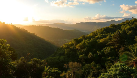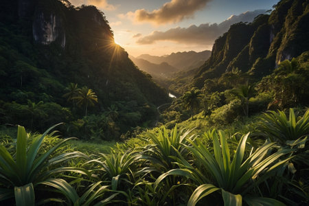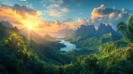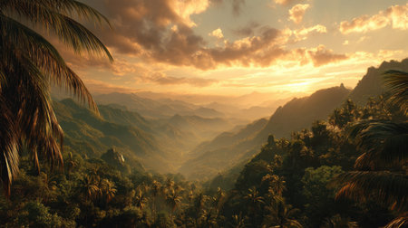 Experience the stunning beauty of a tropical sunset illuminating majestic mountains and a lush jungle, creating a serene and tranquil atmosphere.
