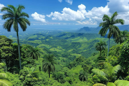 Panoramic view of tropical rainforest with palm trees and mountains on background