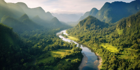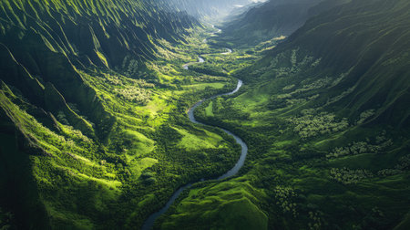 Stunning aerial shot of a tranquil river winding through a lush green mountain valley. Serenity and peace are palpable.