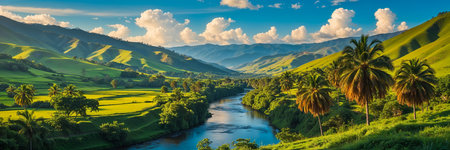 A winding river meanders through lush green hills under a bright sky. Generate AI