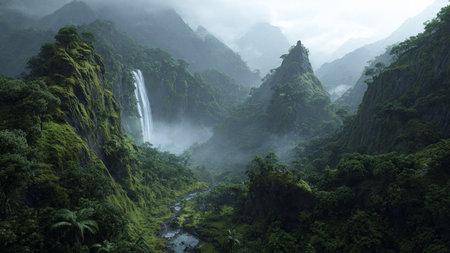 Lush Green Valley Waterfall Misty Mountain Scene fog fern view wild calm rocks