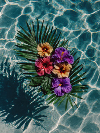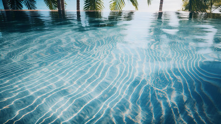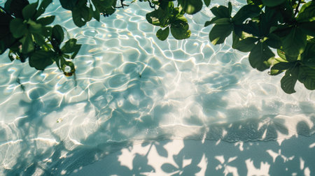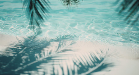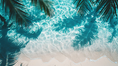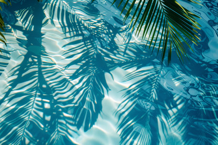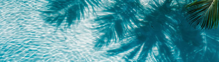 Top view of clear blue water with shadows of palm leaves, perfect for advertising and stock photography, showcasing tranquility and tropical vibes, hyperrealistic style.