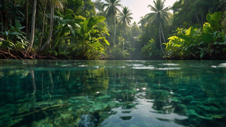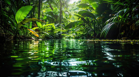 Experience the tranquil beauty of a remote tropical water body framed by vibrant green foliage, creating a serene and peaceful nature escape.