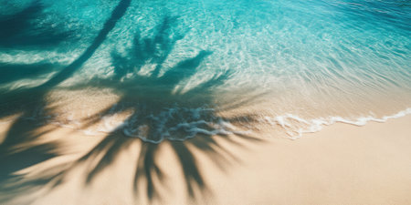 Top-down view of clear water and silhouettes of tropical leaves casting shadows on a white sand beach, ideal for a summer banner.