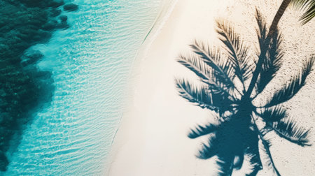 Aesthetic aerial view of white sand coast, light blue ocean and shadows from palm leaves. Luxury holidays. Generative AI.