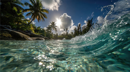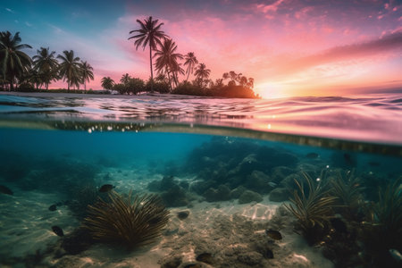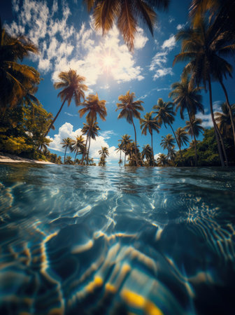 A view of the ocean from under water with palm trees, AI