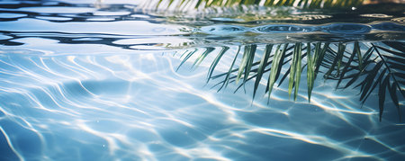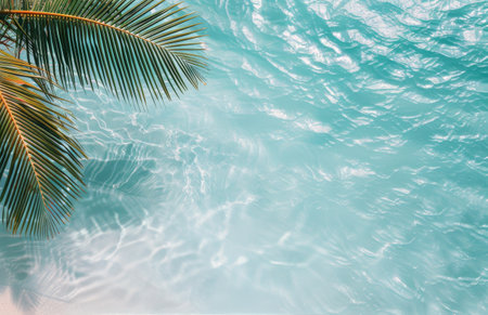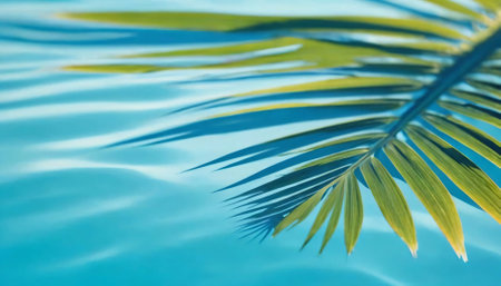A serene and refreshing view of a tropical palm leaf casting a gentle shadow over the ripping surface of crystal-clear blue water. The soft waves and vibrant hues create a peaceful, vacation-like atmosphere, perfect for travel, relaxation, and summer themes.