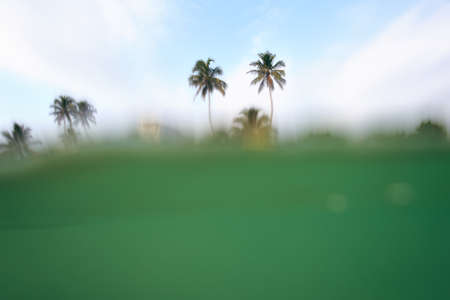 Underwater view of palm trees and sea water surface under sunlight.