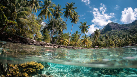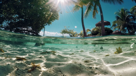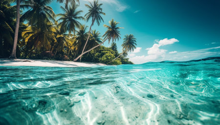 Idyllic tropical coastline, turquoise waters, palm trees, and underwater beauty generated by artificial intelligence