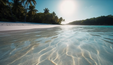 Idyllic tropical coastline, transparent water, and palm tree beauty in nature generated by artificial intelligence