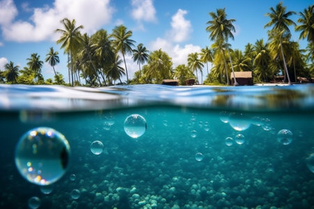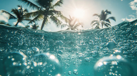 Captivating underwater scene showcasing bubbles rising toward the surface under bright sunlight with tropical palms in the background, evoking a sense of tranquility.